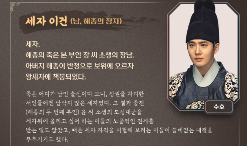 배우 수호는 힙하게 이후로 6개월만에 복귀하게된 작품입니다. 해종의 장자이자, 해종의 죽은 본 부인 장 씨의 소생으로, 해종이 반정으로 보위에 오르자 왕세자로 책봉되었습니다.