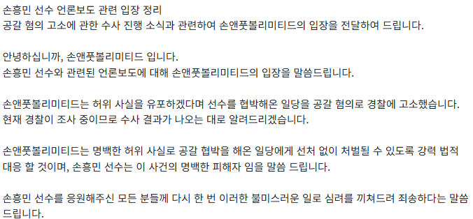손흥민의 매니저는 3개월간 이어진 B씨의 협박에 시달리다가 결국 손흥민에게 이 사실을 털어놓았고, 손흥민은 더 이상 허위 사실에 고통받지 않겠다며 강경 대응을 결심, 경찰에 고소장을 제출했습니다.