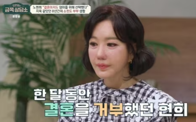 노현희는 결혼 당시 어머니의 강요로 인해 원치 않는 결혼을 하게 되었고, 8년간의 결혼 생활 동안 쇼윈도 부부로 살며 지옥 같은 시간을 보냈다고 고백했습니다.