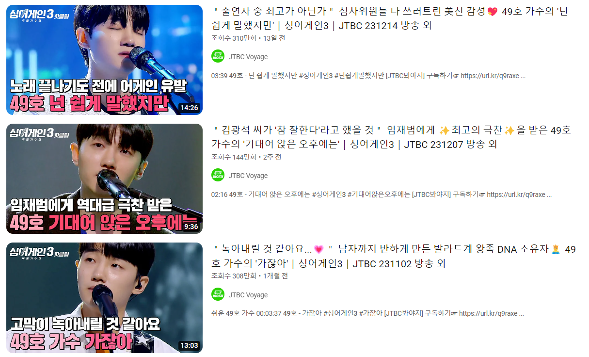 싱어게인3에서 그가 불렀던 가잖아, 혼자만의 느낌, 기대어 앉은 오후에는, 넌 쉽게 말하지만 등을 현재까지 불렀으며 모두 큰 호평을 받았습니다.