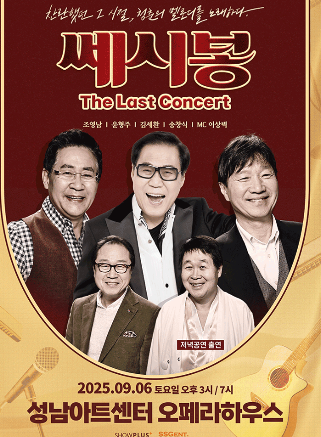 2025년에 쎄시봉의 전국 투어 콘서트가 열릴 예정입니다. 이번 콘서트는 쎄시봉 원년 멤버들인 조영남, 윤형주, 김세환, 송창식, 그리고 MC 이상벽이 함께하는 마지막 무대 공연으로 기획되었습니다.