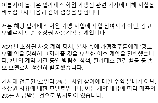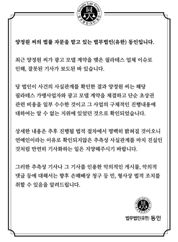 양정원은 최근 사기 혐의로 피소된 사건과 관련하여 자신의 소셜미디어에서 입장을 밝혔습니다. 그녀는 필라테스 학원 가맹점에 대한 기사와 관련해 사실을 명확히 하고자 하였으며, 해당 가맹 사업에 사업 참여자가 아닌 광고 모델로서 초상권 사용계약을 체결했다고 설명했습니다.