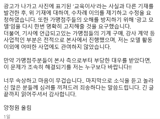 양정원은 가맹점의 기계 구매나 강사 계약 등 사업적 결정은 본사가 전적으로 책임지고 있으며, 자신은 모델 활동 이외에는 어떤 사업에도 관여하지 않았다고 덧붙였습니다.