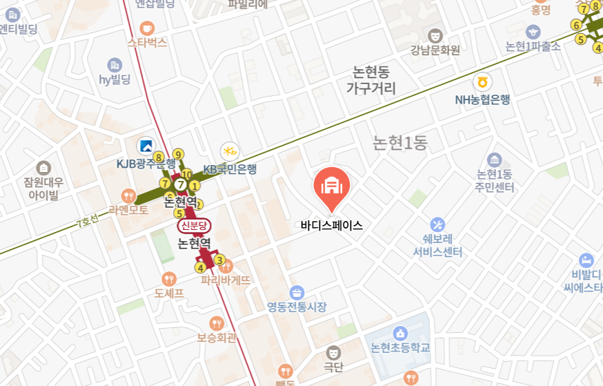 양치승 관장이 운영하는 헬스장 바디스페이스는 서울 강남구 논현동에 위치하고 있습니다. 좀 더 자세히 알려드리면 지하철 7호선과 신분당선 논현역에서 도보로 5분 거리에 있는 서울 강남구 학동로6길에 있습니다. 강남의 중심 상업 지구에 자리 잡고 있어 접근성이 매우 뛰어나다고 할 수 있습니다.