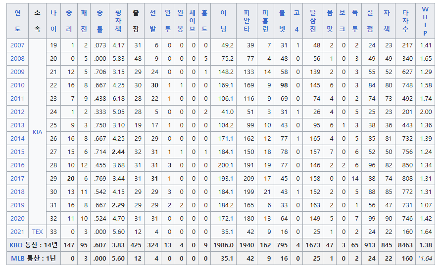 2. 양현종 통산 기록 메이저리그 성적
