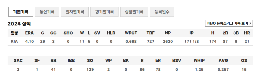 2024 시즌은 KBO 리그에 공인구 반발력 조정, ABS 도입 등 변화가 많았던 타고투저 시즌이었는데, 양현종 선수는 171⅓이닝을 소화하며 4점대 평균자책점을 기록했습니다.