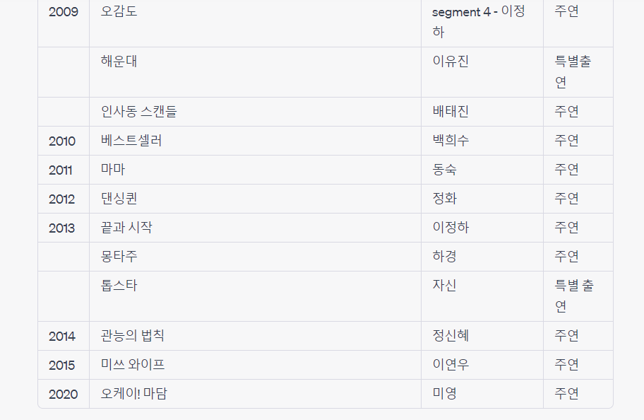 연기자로 데뷔한 그녀는 배역을 가리지 않고 다양한 이미지를 선보였으며 여러 작품에서 높은 평가를 받았다. 영화에서도 굉장히 다양한 영화에 출연하며 뛰어난 연기를 보여주었습니다.