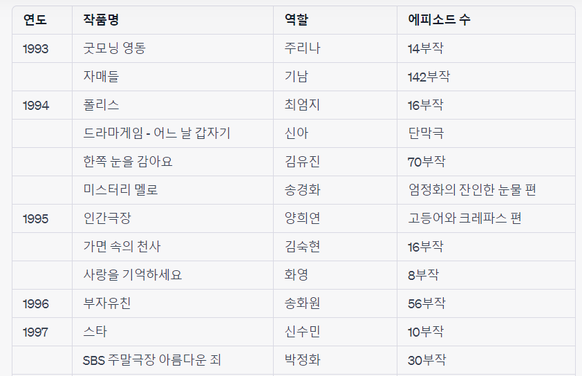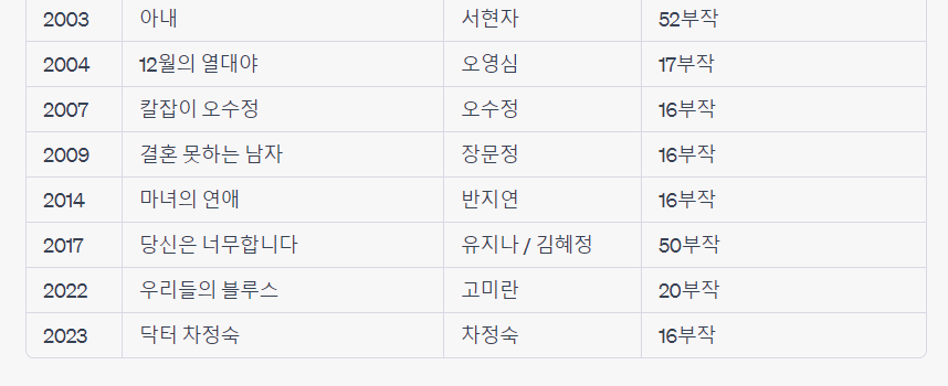 특히 2022년 드라마 우리들의 블루스에서의 연기가 높은 평가를 받았습니다. 미란 역으로서 다양한 감정과 관계를 묘사하여 호평을 받았으며 연기 내공을 입증하는 작품이었습니다. 가장 최근인 2023년에는 JTBC 드라마 닥터 차정숙으로 컴백하여 높은 시청률과 화제성을 얻으며 또 성공을 거두게 됩니다.