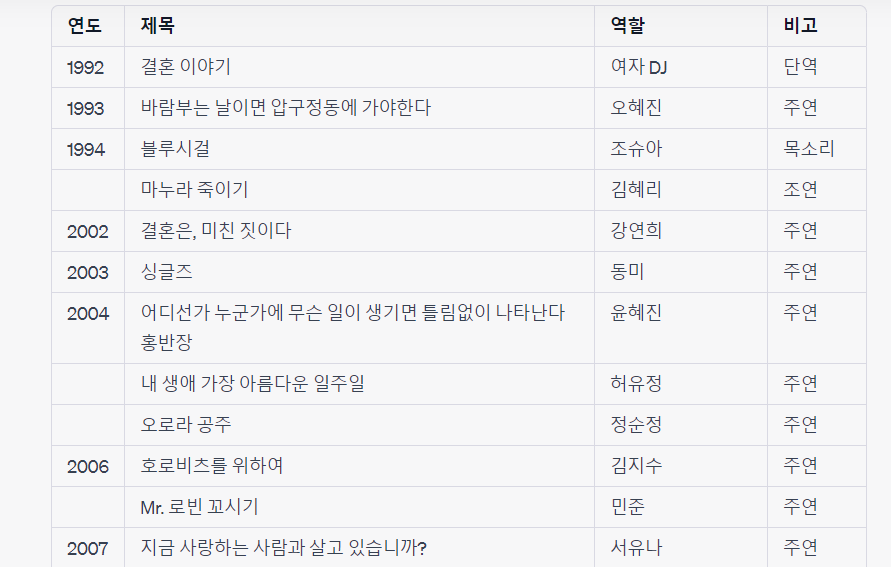 연기자로 데뷔한 그녀는 배역을 가리지 않고 다양한 이미지를 선보였으며 여러 작품에서 높은 평가를 받았다. 영화에서도 굉장히 다양한 영화에 출연하며 뛰어난 연기를 보여주었습니다.
