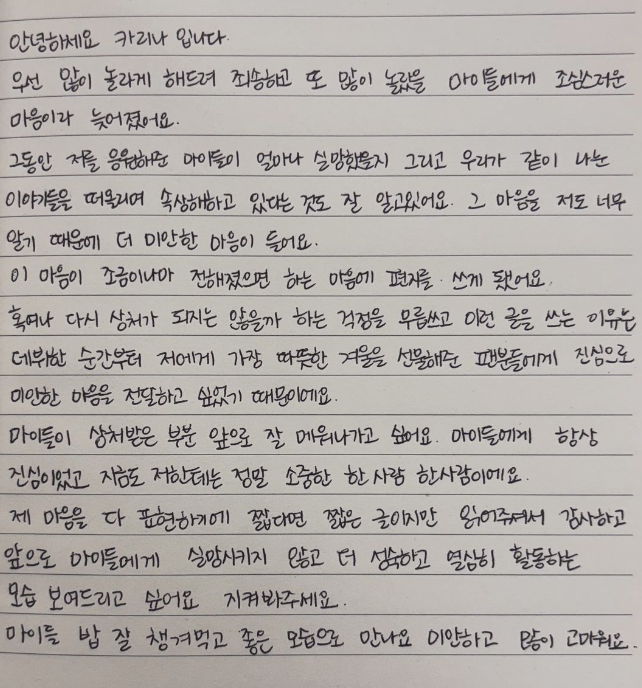 열애설이 나오고 나서 일부 팬들은 아쉬운 마음을 보이기도 하였습니다. 이후 카리나님은 자신의 SNS등을 통하여 열애 인정후에 자필 사과문까지 올리며 많이 놀라게 해드려 죄송하다고 말했습니다.