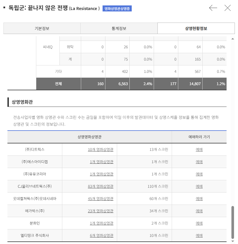 참고로 영화진흥위원회(KOFIC) 영화관 입장권 통합전산망을 통해 영화 독립군: 끝나지 않은 전쟁의 상영관과 예매가 가능합니다. 이 시스템에서는 전국 주요 영화관에서 상영 중인 이 영화의 상영 시간과 장소를 확인할 수 있으며, 예매도 바로 할 수 있습니다.