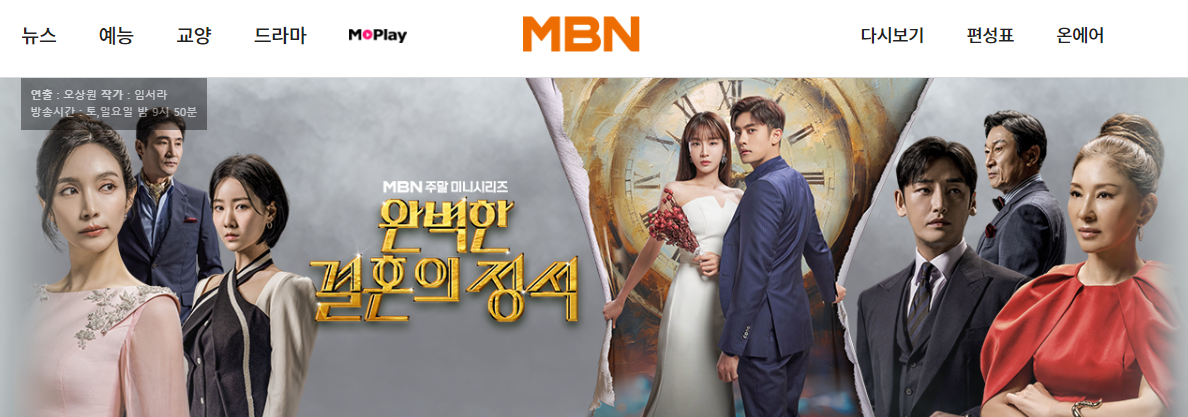 완벽한 결혼의 정석은 주말 저녁 9시 50분 MBN방송사에서 방영중인 드라마입니다. 2023년 10월 28일부터 2023년 12월 3일까지 예정되어 있으며 총 12부작입니다.