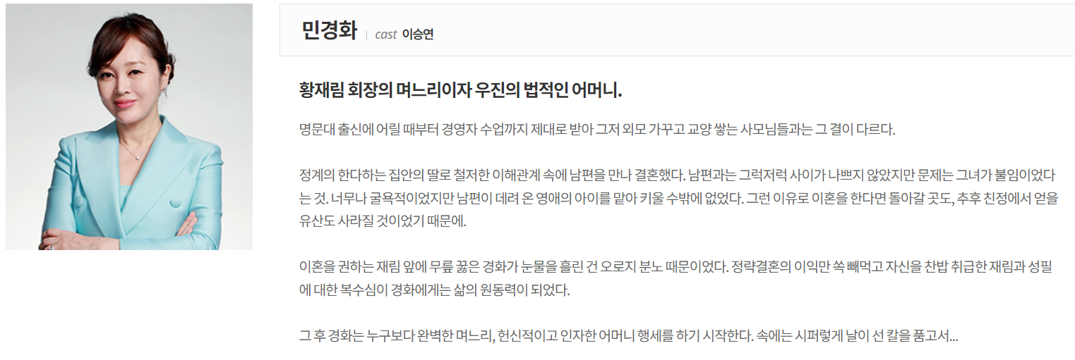 주우진의 법적인 엄마 민경화 역의 이승연 배우등이 출연합니다. 민경화는 명문대 출신으로 어릴 적부터 경영자 교육을 받아왔습니다. 다른 사모님들과는 다르게 외모뿐만 아니라 교양까지 쌓아왔습니다.