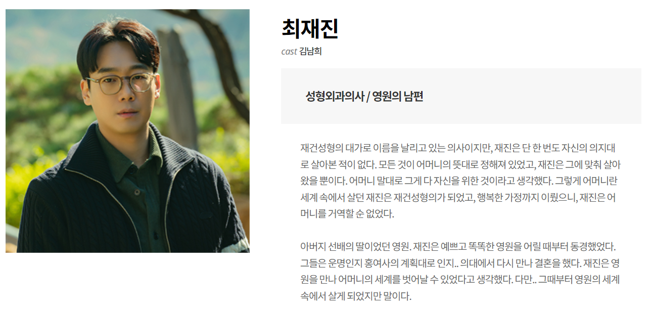 김남희 배우가 연기하는 최재진은 재건성형 분야에서 명성을 떨치는 의사입니다. 하지만 그의 삶은 어머니 홍사강의 철저한 계획 아래 놓여 있었습니다.