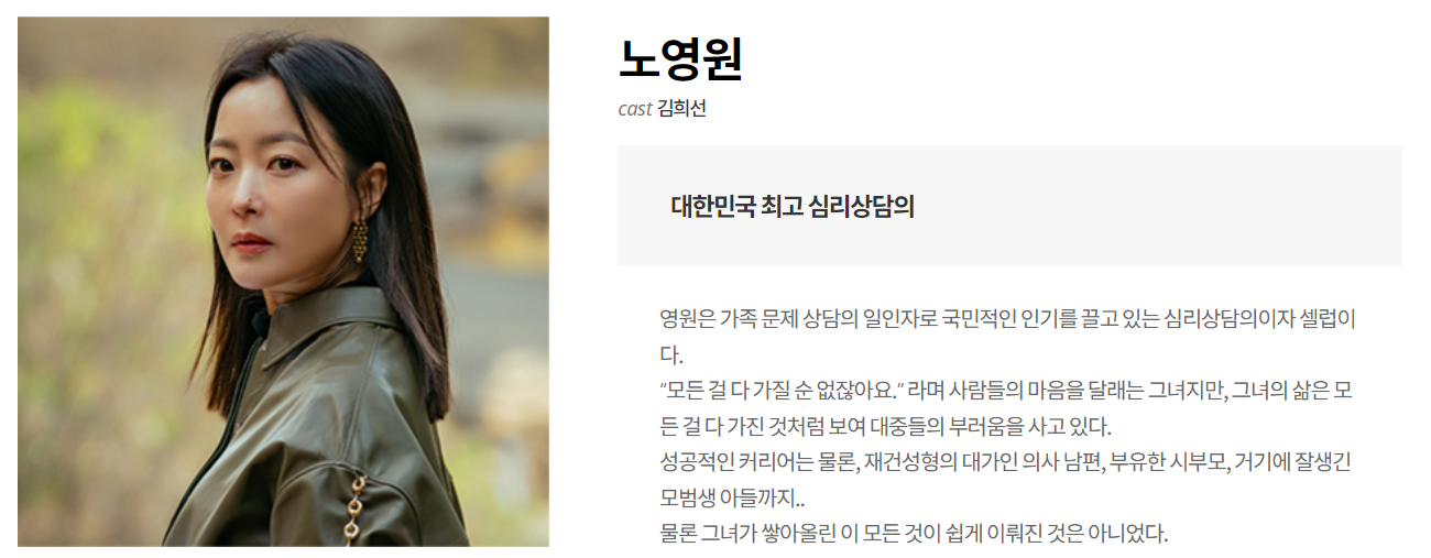 믿고보는 레전드 여배우 김희선을 비롯하여 이혜영, 김남희, 연우등 배우들은 각자의 캐릭터에 완벽하게 몰입하여 극의 몰입도를 높이고 있습니다.