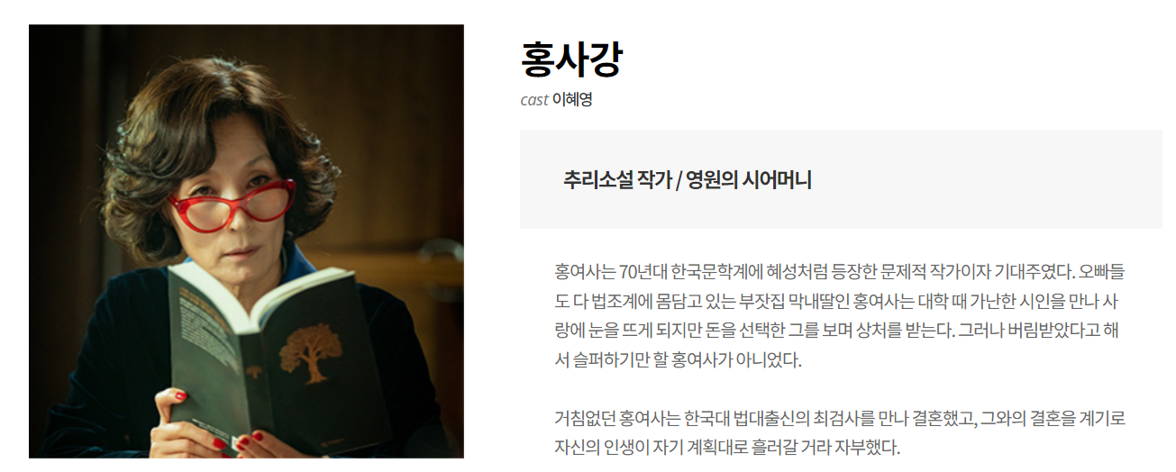 이혜영 배우는 홍사강 역을 맡았습니다. 직업은 영원의 시어머니, 재진의 어머니에 해당힙니다. 이혜영 배우가 맡은 홍사강은 70년대 한국 문학계를 뒤흔든 추리소설 작가입니다.