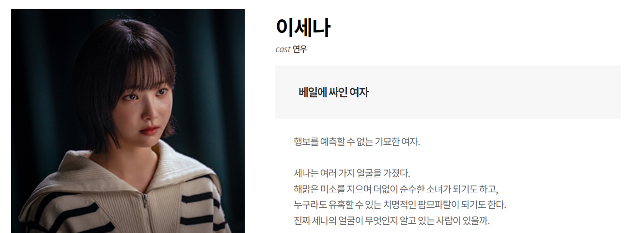 연우 배우는 이세나 역을 맡았습니다. 베일에 싸인 여자 캐릭터이며 행보를 예측할 수 없는 기묘한 여자로 등장합니다. 순수한 소녀의 모습부터 치명적인 팜므파탈의 모습까지, 그녀는 다채로운 얼굴을 가지고 있습니다.