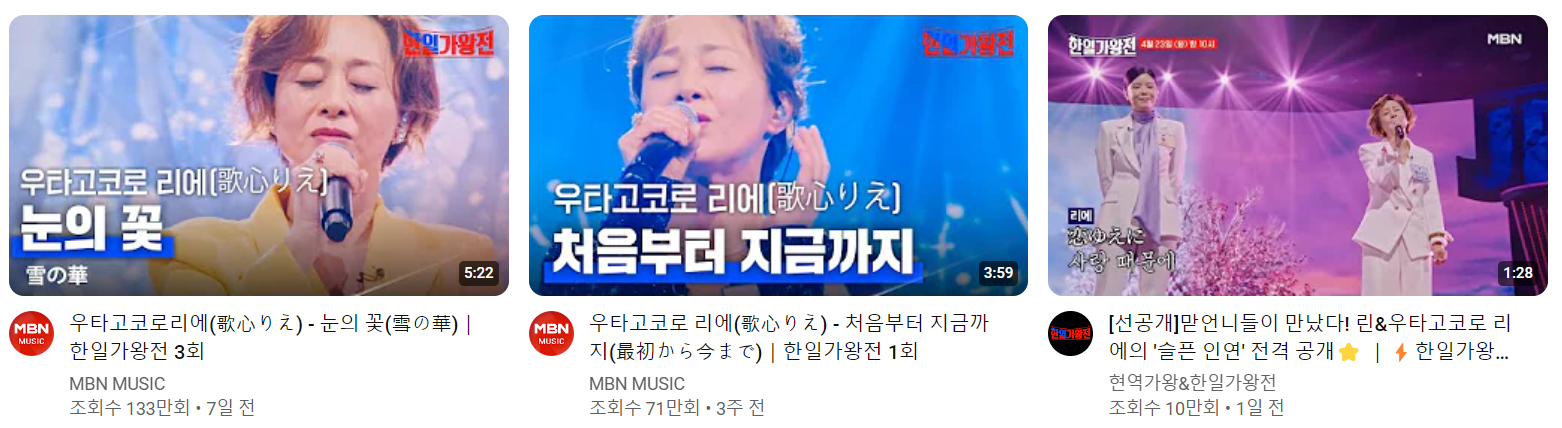 린과 함께 부른 슬픈인연은 이번 방송의 백미라고 볼수 있습니다. 우타고코로 리에의 목소리는 정교하면서도 예쁘고 사이다 같은 시원함도 있습니다.