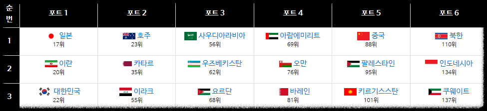 아시아 지역 월드컵 예선에서도 이런 포트 시스템이 적용됩니다. 포트의 숫자는 예선의 단계에 따라 다릅니다. 2026 FIFA 월드컵 아시아 3차 예선 조 추첨을 위해 국가들을 FIFA 랭킹에 따라 6개의 포트로 나뉘어져 있습니다.