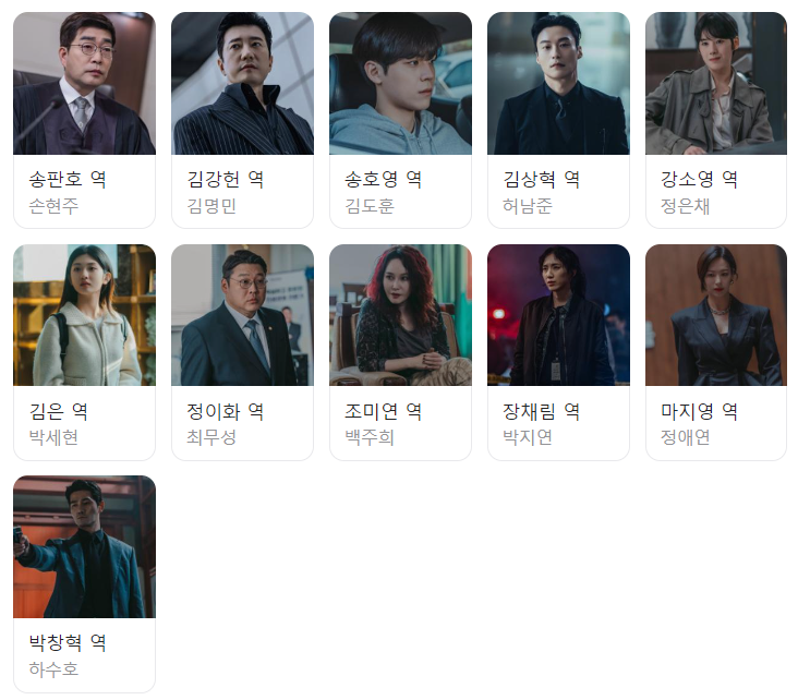 주요 출연진으로는 손현주, 김명민, 김도훈, 허남준, 정은채 등이 있으며, 이들이 펼치는 강렬한 연기와 복잡한 인간 관계가 드라마의 긴장감을 한층 더 끌어올립니다.