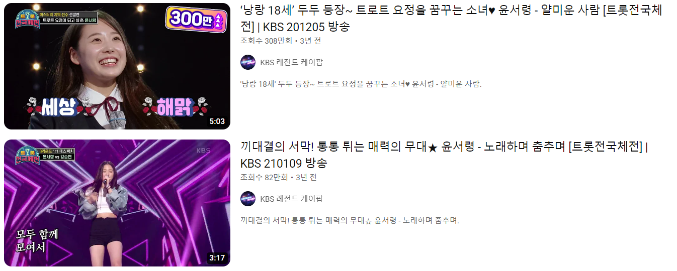 당시 학생이였던 윤서령 가수는 어린나이지만 독보적인 노래실력과 트로트 흥, 끼를 발산하면서 시청자들로부터 눈도장을 받기 시작했습니다.