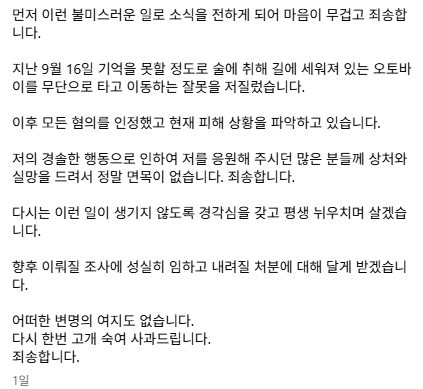 윤지온은 “기억할 수 없을 정도로 술에 취해 잘못을 저질렀다”며 “저의 경솔한 행동으로 응원해 주셨던 많은 분들께 상처와 실망을 드려 매우 죄송하다”고 사과하였으며, 다시는 이런 일이 발생하지 않도록 평생 반성하며 살겠다고 다짐했습니다. 또한, 향후 진행될 모든 조사와 법적 처분에 성실히 임할 것임을 밝혔습니다.
