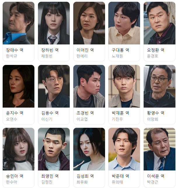 주연으로는 한석규, 채원빈, 한예리, 노재원, 윤경호, 오연수 등 다양한 배우들이 출연해 긴장감 넘치는 연기를 선보입니다.