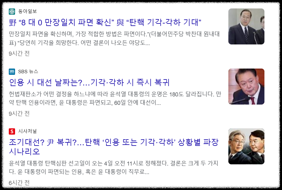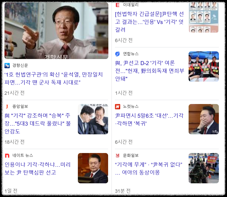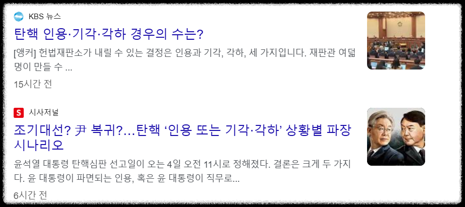 정리해보자면 인용은 청구인의 주장이 받아들여져 대통령 파면과 같은 조치가 이루어지는 경우이고, 기각은 청구인의 주장이 받아들여지지 않아 탄핵이 무효화되는 경우이며, 각하는 절차적 요건을 갖추지 못해 본안 판단 없이 사건이 종료되는 경우를 뜻합니다.