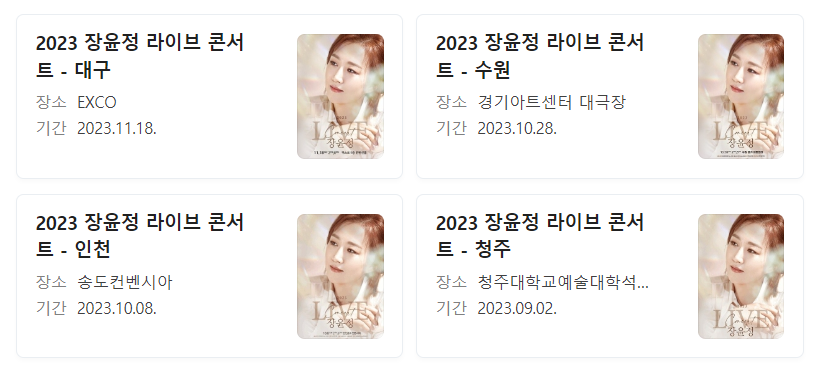 2023년도의 남아있는 장윤정님 라이브 콘서트 일정은 다음과 같으며 장윤정님의 팬카페등을 확인하시면 자세한 정보는 확인하실 수 있습니다.