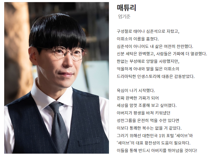 출연 배우로는 엄기준 배우와 남편 이영돈과의 이혼 소송으로 화제가 되었던 배우 황정음등이 출연합니다. 앞서 공개된 예고편에서는 전혀 달라진 민도혁의 새로운 모습과 변화를 예고하였습니다.