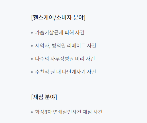 단순한 형사 변론을 넘어, 기업과 기관을 대상으로 한 수사 대응 전략 수립과 준법경영 컨설팅에도 관여하며, 사전 리스크 관리 영역에서도 전문성을 발휘하고 있습니다. 검사 시절 축적한 조세와 회계 수사 경험을 바탕으로 증권 금융 분야 교육과 자문에도 참여하며, 대형 로펌 내에서도 특수 수사 출신 변호사로서의 존재감을 유지하고 있습니다.