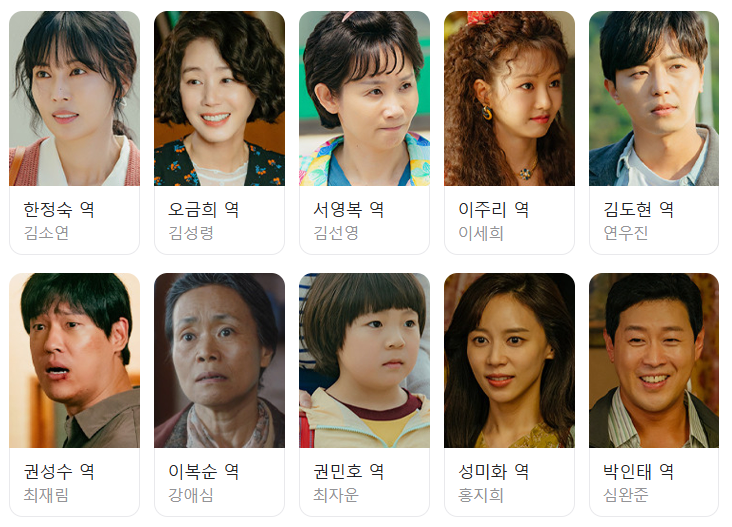 김원해와 라미란은 '나쁜 엄마' 이후 1년 만에, 김선영과 강애심은 영화 '콘크리트 유토피아' 이후 1년 만에 다시 만났습니다. 김원해와 정영주는 '선재 업고 튀어' 이후 6개월 만에, 서현철, 김정진, 주인영은 '소년시대' 이후 10개월 만에 재회했습니다.