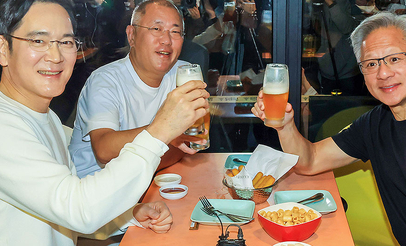 젠슨 황 엔비디아 최고경영자(CEO)는 2025년 10월 30일 서울 삼성동에 위치한 한 치킨집 '깐부치킨'에서 이재용 삼성전자 회장, 정의선 현대자동차그룹 회장과 함께 약 70분간 비공식 치맥 회동을 가졌습니다. 이 자리에서 세 사람은 치킨과 맥주를 즐기며 친밀한 대화를 나누었으며, '소맥 러브샷'을 하며 우의를 다지는 모습도 연출되었습니다.