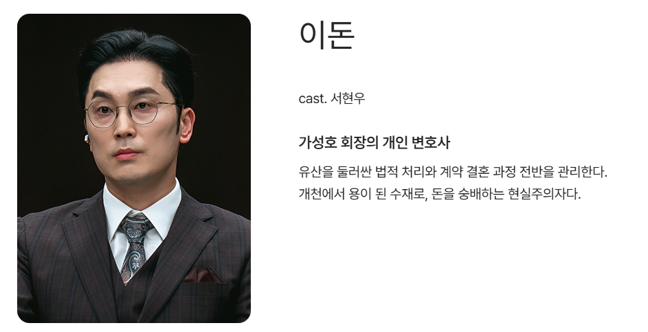이돈 역: 서현우가 맡아 연기합니다. 가성 그룹 회장의 개인 변호사로, 유산을 둘러싼 법적 처리와 계약 결혼 과정 전반을 관리하는 현실주의자입니다.