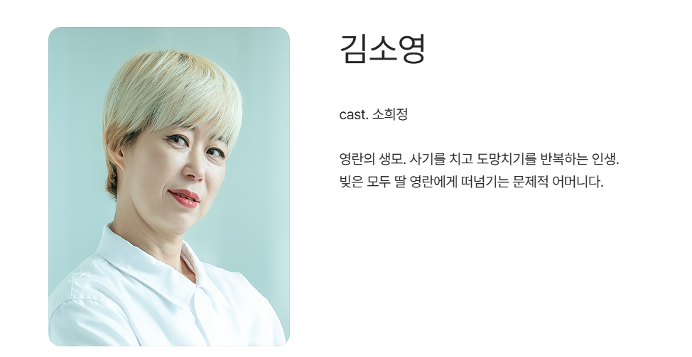 백혜지 역: 주현영이 맡았습니다. 가성 그룹 회장 저택에서 일하는 도우미이며, 김영란(부세미)의 룸메이트로서 이야기의 중요한 변수로 작용하는 인물입니다.