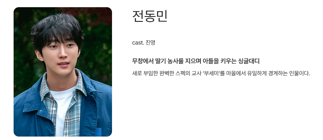 전동민 역: 진영이 연기합니다. 무창에서 딸기 농사를 지으며 아들을 키우는 싱글대디로, 새로 부임한 완벽한 스펙의 유치원 교사 부세미를 마을에서 유일하게 경계하는 인물입니다.