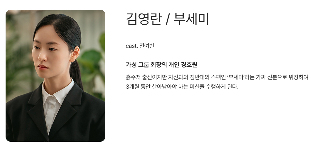 김영란 / 부세미 역: 전여빈이 맡았습니다. 김영란은 가성 그룹 회장의 개인 경호원으로, 흙수저 출신이지만 자신과 완전히 다른 스펙인 부세미라는 가짜 신분으로 위장하여 3개월 동안 살아남아야 하는 미션을 수행하는 인물입니다.