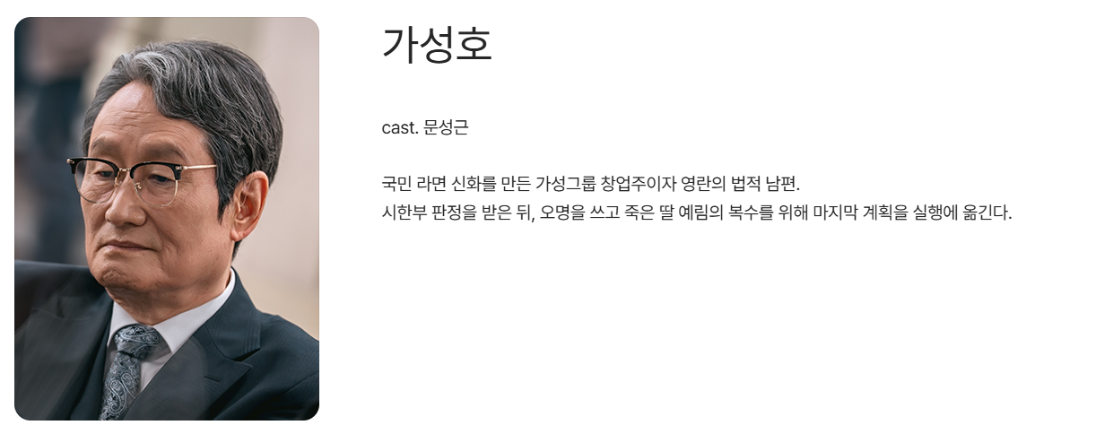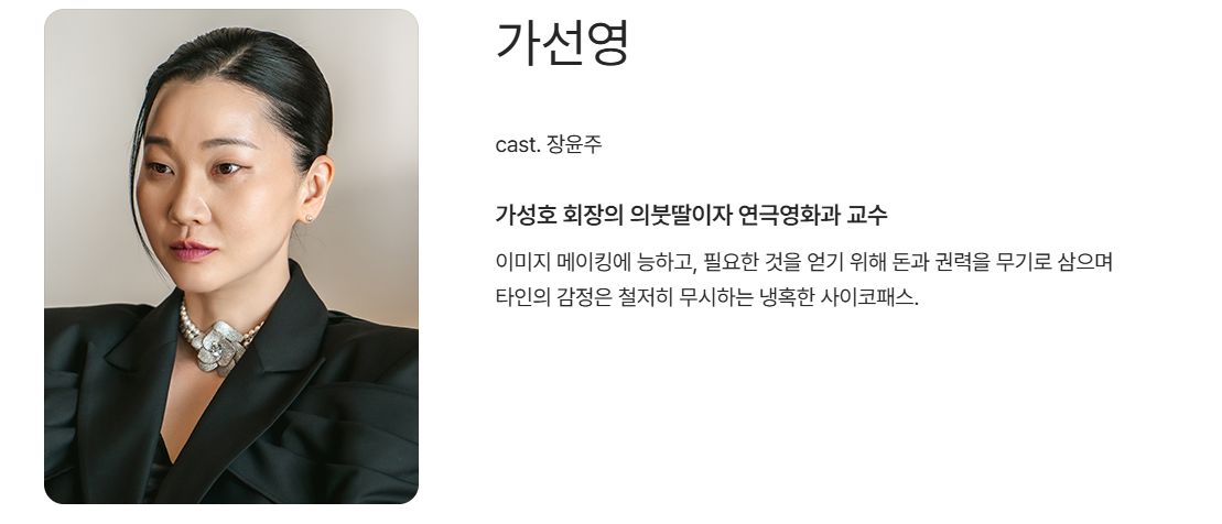 가선영 역: 장윤주가 연기합니다. 가성 그룹 회장의 의붓딸이자 연극영화과 교수이며, 필요한 것을 얻기 위해 돈과 권력은 물론 사람의 감정도 가리지 않는 냉혹한 소시오패스 캐릭터입니다.