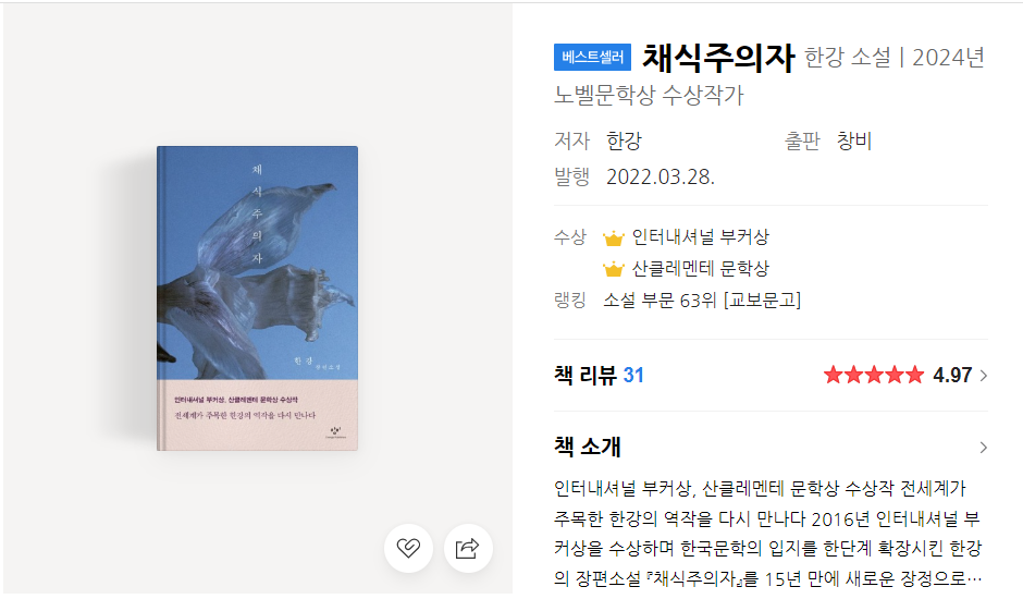 채식주의자는 2016년 맨부커상 인터내셔널 부문 수상으로 이미 국내외에서 큰 화제를 모았던 작품입니다. 이번 노벨 문학상 수상은 한강 작가의 문학적 성과를 세계적으로 인정받는 계기가 되었을 뿐만 아니라, '채식주의자'를 비롯한 그의 작품들이 다시금 독자들의 관심을 받는 데 큰 영향을 미쳤습니다.
