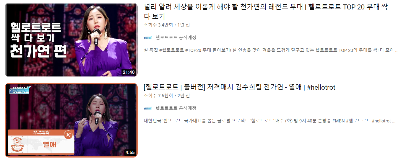 그만큼 천가연님의 노래실력과 재능이 뛰어나다고 판단을 하였기 떄문입니다. 특히 천가연님을 개인적으로 첫 만나게된 무대는 헬로트로트를 통해서 였습니다.