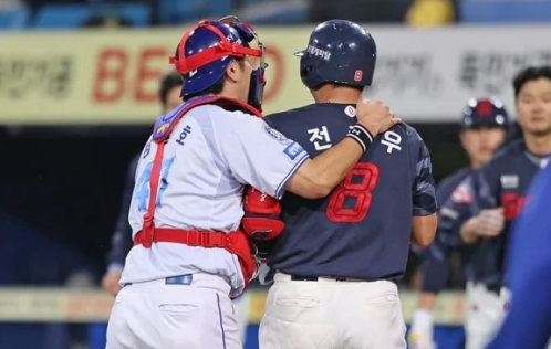 전준우는 손가락 두 개를 펴 보이며 "두 번째야"라고 말하는 듯한 제스처를 했고, 최원태는 억울하다는 듯 두 팔을 들어 보였습니다. 전준우가 마운드 쪽으로 다가가려 하자 삼성 포수 강민호가 전준우를 껴안아 제지했고, 양 팀 선수들이 그라운드로 뛰어나와 벤치 클리어링이 벌어졌습니다.