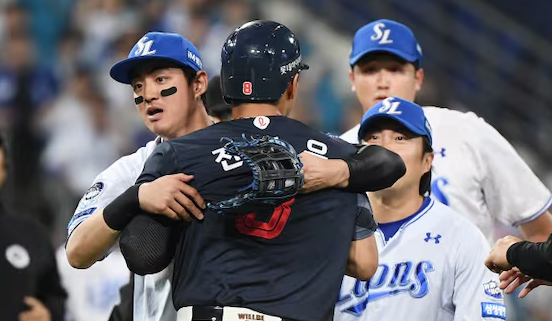 전준우는 손가락 두 개를 펴 보이며 "두 번째야"라고 말하는 듯한 제스처를 했고, 최원태는 억울하다는 듯 두 팔을 들어 보였습니다. 전준우가 마운드 쪽으로 다가가려 하자 삼성 포수 강민호가 전준우를 껴안아 제지했고, 양 팀 선수들이 그라운드로 뛰어나와 벤치 클리어링이 벌어졌습니다.