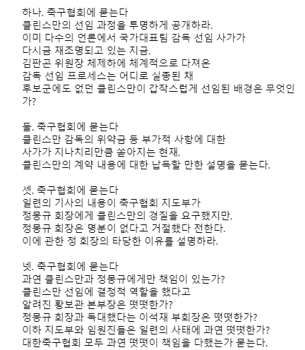 얼마전 독일 주간지 슈피겔 인터뷰를 진행했던 클린스만이 벤투때와 같은 공정한 선임 과정을 거쳐서 감독을 선임했다는 정몽규 회장의 주장과 배치되는 인터뷰 내용들이 전해지면서 논란은 현재까지 진행중인 상황입니다.