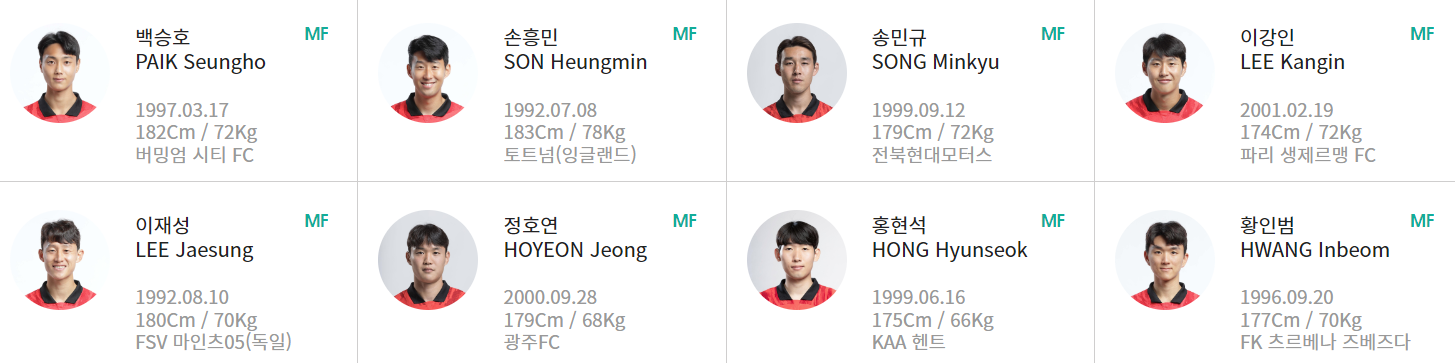 미드필더로는 늘 꾸준히 기용받는 이재성(마인츠)과 황인범(츠르베나 즈베즈다)을 비롯하여 주장 손흥민 선수와 탁구 논란등으로 큰 관심을 모았던 이강인(파리 생제르맹)을 선발하였습니다.