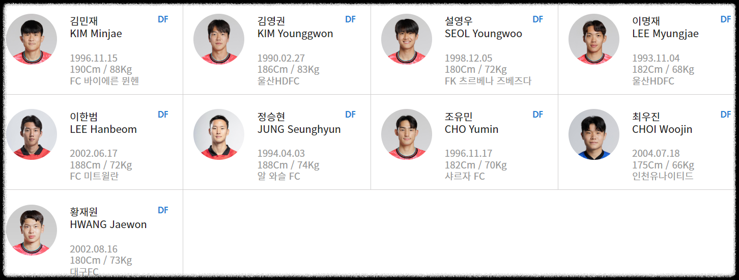 수비수로는 권경원(코르파칸 클럽), 김민재(바이에른 뮌헨), 김영권(광저우 FC), 이명재(울산 현대), 정승현(알와슬), 이한범(미트윌란), 설영우(크르나즈다르), 최우진(인천 유나이티드), 황문기(강원 FC), 김문환(대전 하나 시티즌)이 선발되었습니다.