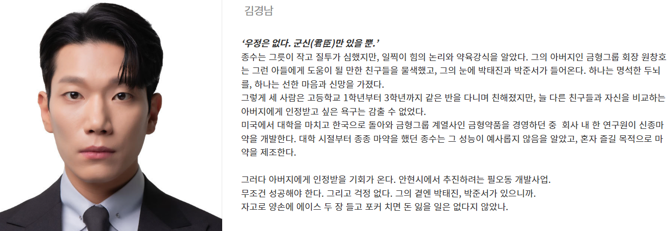 김경남 배우는 원종수 역을 맡았습니다. 원종수는 질투심 많고 욕심 많은 재벌 2세입니다. 어릴 적부터 아버지의 인정을 받기 위해 끊임없이 노력했지만, 늘 다른 친구들과 비교당하며 열등감에 시달렸습니다.
