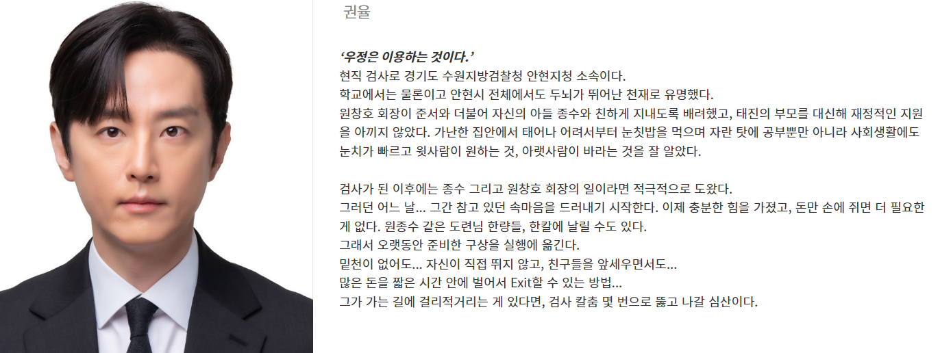 권율 배우는 박태진 역을 맡았습니다. 권율은 6월 12일에 방송되는 JTBC 수목드라마 놀아주는 여자에서도 검사 역할을 맡습니다. 박태진은 어릴 때부터 뛰어난 두뇌로 주목받았던 천재입니다.