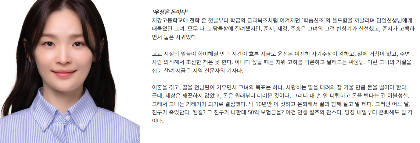 기자로서의 그녀는 세상의 더러움과 맞서며 살아가고 있지만, 이혼후 딸을 위해 돈을 벌어야 하는 현실적인 목표를 가지고 있습니다. 그녀의 복잡한 성격과 상황은 드라마에서 중요한 요소로 작용할 것입니다.