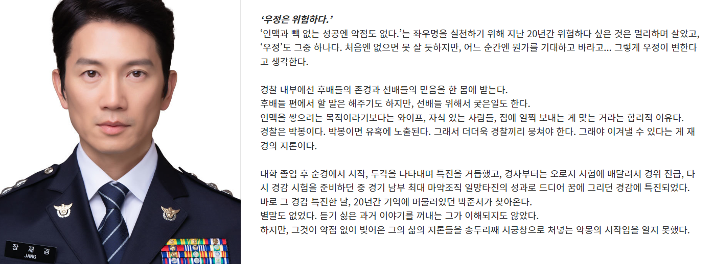 대학 졸업 후 순경으로 시작해 특진을 거듭하며 마침내 꿈에 그리던 경감 자리에 오른 장재경입니다. 하지만 그의 인생은 20년 전 잊고 지냈던 친구 박준서의 등장으로 송두리째 흔들리게 됩니다.