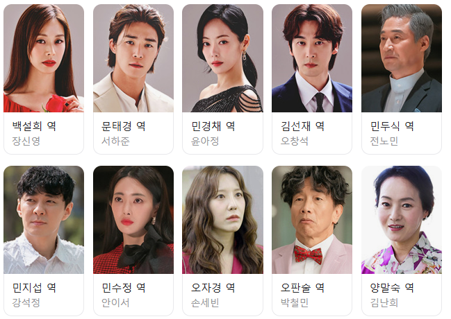 설희와 함께 복수의 길을 걷는 문태경, 그리고 재벌가의 후계자 민경채와 법무팀장 김선재 등 다양한 인물들이 얽히며, 각자의 욕망과 비밀이 드라마의 긴장감을 더합니다. 기존 일일극의 전형적인 설정을 벗어나, 현실적인 감정과 사회적 메시지를 강조하는 점도 이 작품의 특징입니다.